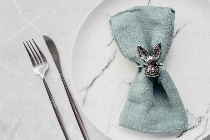 Баннер. Сервировка стола. Модная мраморная тарелка с кроликом на салфетке, пасхальными яйцами и перьями на сером фоне. Вид сверху. Концепция счастливого пасхального праздника для кафе и ресторанов