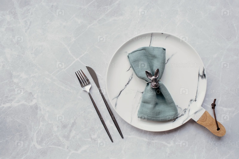 Баннер. Сервировка стола. Модная мраморная тарелка с кроликом на салфетке, пасхальными яйцами и перьями на сером фоне. Вид сверху. Концепция счастливого пасхального праздника для кафе и ресторанов