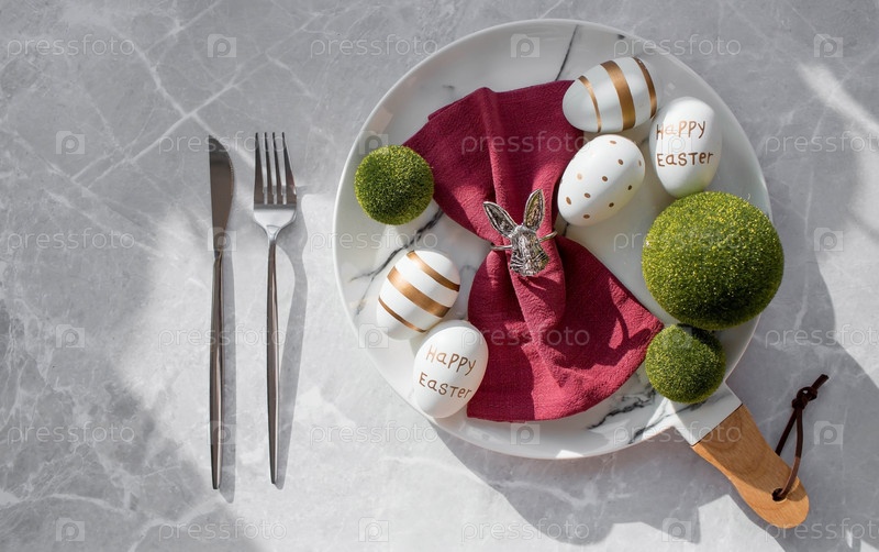 Баннер. Сервировка стола. Модная мраморная тарелка с кроликом на салфетке, пасхальными яйцами и перьями на сером фоне. Вид сверху. Концепция счастливого пасхального праздника для кафе и ресторанов
