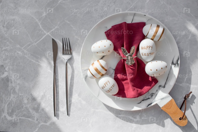 Баннер. Сервировка стола. Модная мраморная тарелка с кроликом на салфетке, пасхальными яйцами и перьями на сером фоне. Вид сверху. Концепция счастливого пасхального праздника для кафе и ресторанов