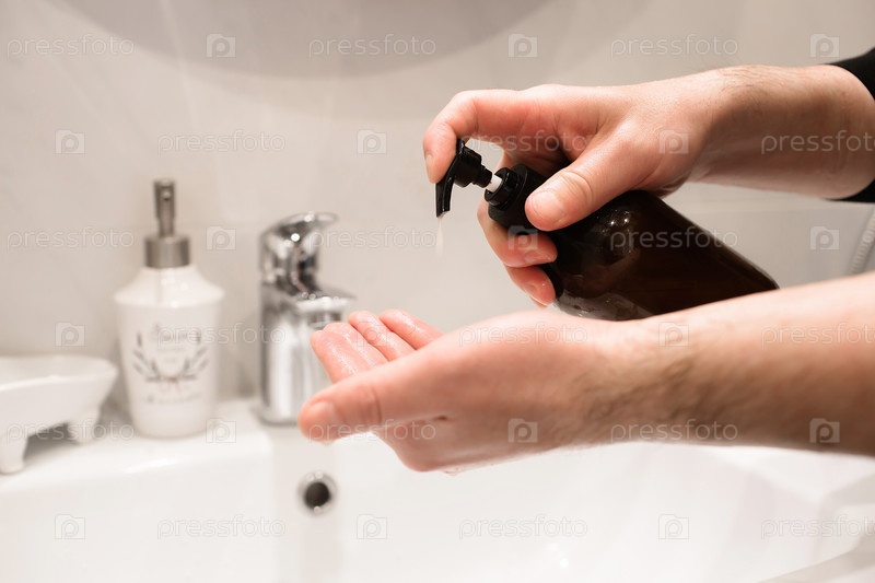 Мытье рук с мылом для профилактики вируса короны, гигиена, чтобы остановить распространение коронавируса. Мужские руки. Крупный план