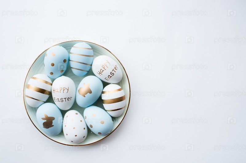 Баннер. Синие и белые пасхальные яйца на белом изолированном фоне. Геометрия. Минимальная концепция. Вид сверху. Карточка с местом для копирования текста
