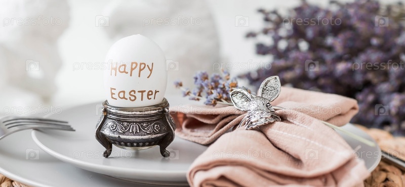 Сервировка стола. Тарелка с пасхальными яйцами, кроликами, лавандой и салфеткой с техникой на белом столе. На заднем плане кухня в скандинавском стиле. Концепция светлого праздника Пасхи