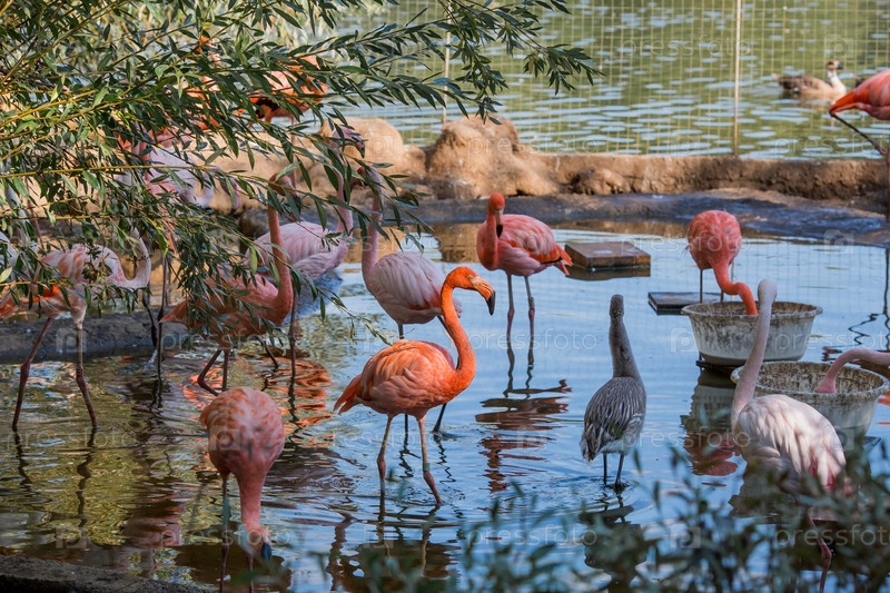 Птицы. Розовые и ярко-красные фламинго в Московском зоопарке