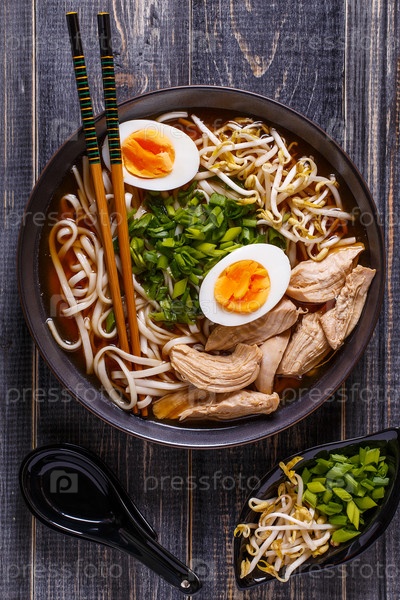 Японский суп рамен с курицей, яйцом, зеленым луком и ростками