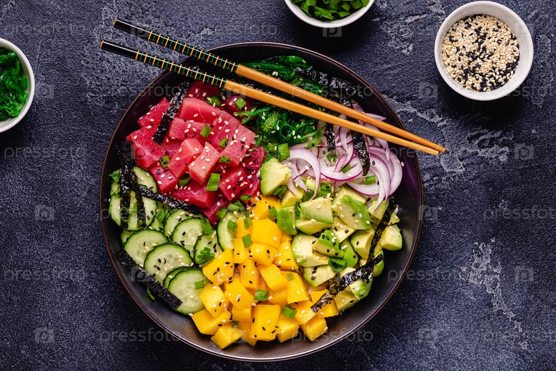 Гавайская поке из тунца с водорослями, авокадо, манго, огурцом