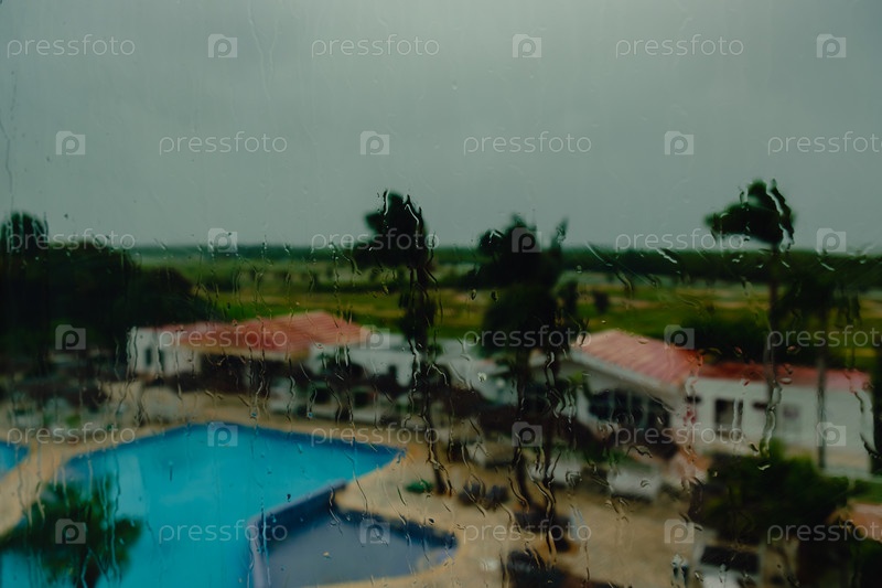 Вид на бассейн и пальмы в отеле через окно с каплями дождя