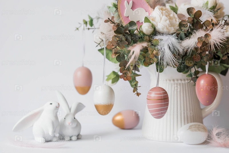 Баннер. Концепция светлого праздника Пасхи. Букет цветов с перьями и белыми кроликами на белом изолированном фоне. Красивая пасхальная открытка