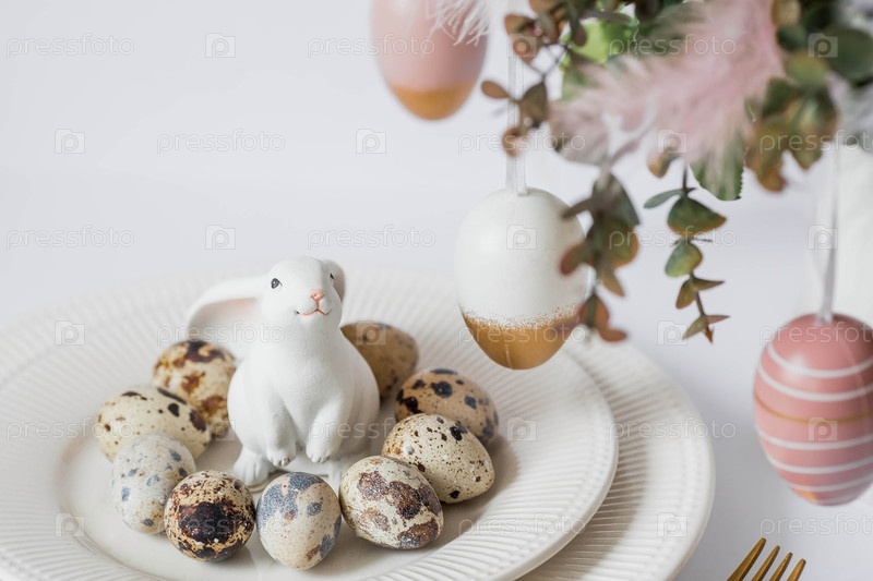 Баннер. Концепция светлого праздника Пасхи. Букет цветов с перьями, белыми кроликами и пасхальными яйцами в тарелке на белом изолированном фоне. Красивая пасхальная открытка