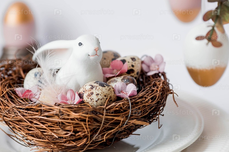Баннер. Концепция светлого праздника Пасхи. Букет цветов с перьями и белыми кроликами на белом изолированном фоне. Красивая пасхальная открытка