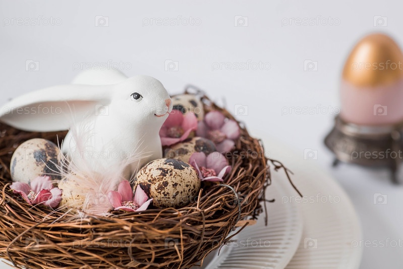 Баннер. Концепция светлого праздника Пасхи. Букет цветов с перьями и белыми кроликами на белом изолированном фоне. Красивая пасхальная открытка