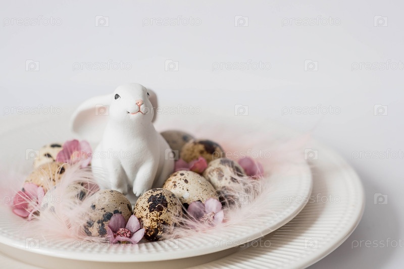 Баннер. Концепция светлого праздника Пасхи. Букет цветов с перьями и белыми кроликами на белом изолированном фоне. Красивая пасхальная открытка