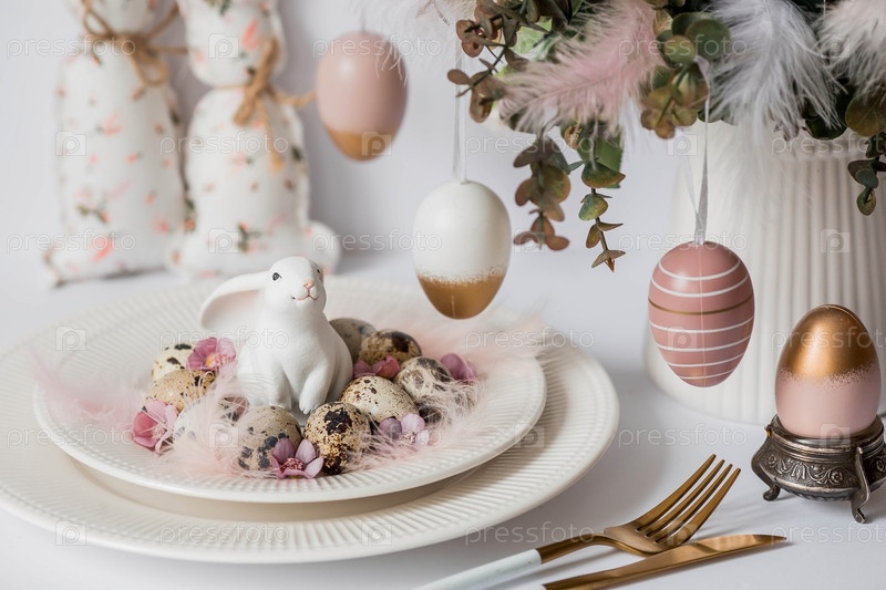 Баннер. Концепция светлого праздника Пасхи. Букет цветов с перьями, белыми кроликами и пасхальными яйцами в тарелке на белом изолированном фоне. Красивая пасхальная открытка