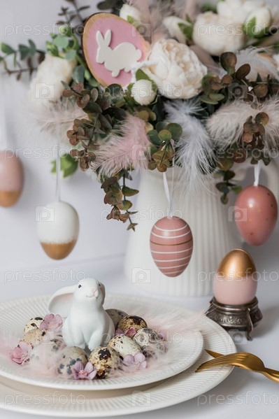 Баннер. Концепция светлого праздника Пасхи. Букет цветов с перьями, белыми кроликами и пасхальными яйцами в тарелке на белом изолированном фоне. Красивая пасхальная открытка