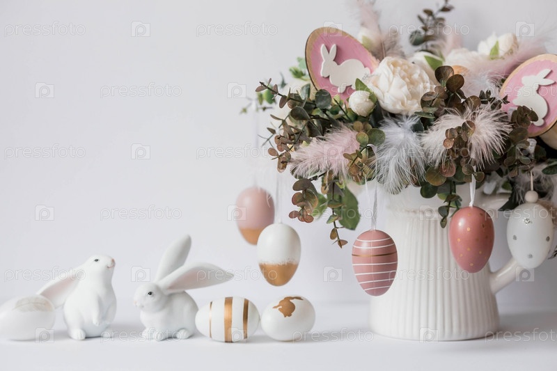 Баннер. Концепция светлого праздника Пасхи. Букет цветов с перьями и белыми кроликами на белом изолированном фоне. Красивая пасхальная открытка