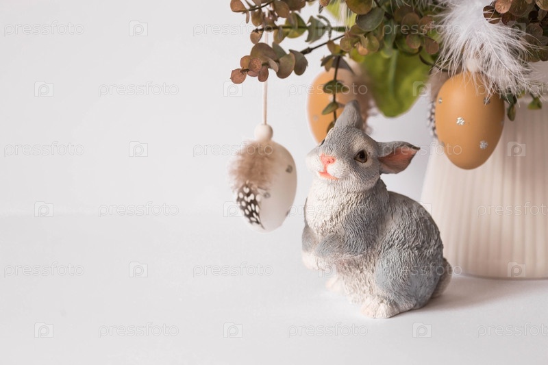 Баннер. Концепция светлого праздника Пасхи. Букет цветов с перьями, серыми кроликами и пасхальными яйцами на белом изолированном фоне. Красивая пасхальная открытка