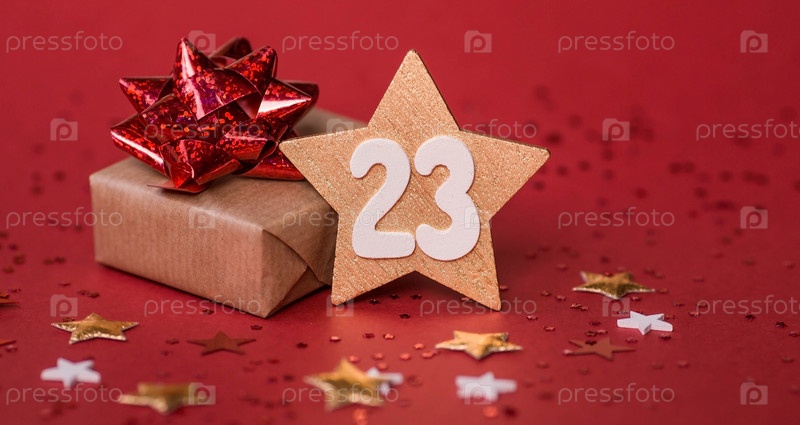 Открытка ко Дню защитника Отечества. Белые, золотые, красные звезды, подарочная коробка и цифра 23 на красном фоне. Праздник 23 февраля