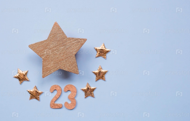 Открытка ко Дню защитника Отечества. Золотые звезды и число 23 на голубом фоне. Праздник 23 февраля