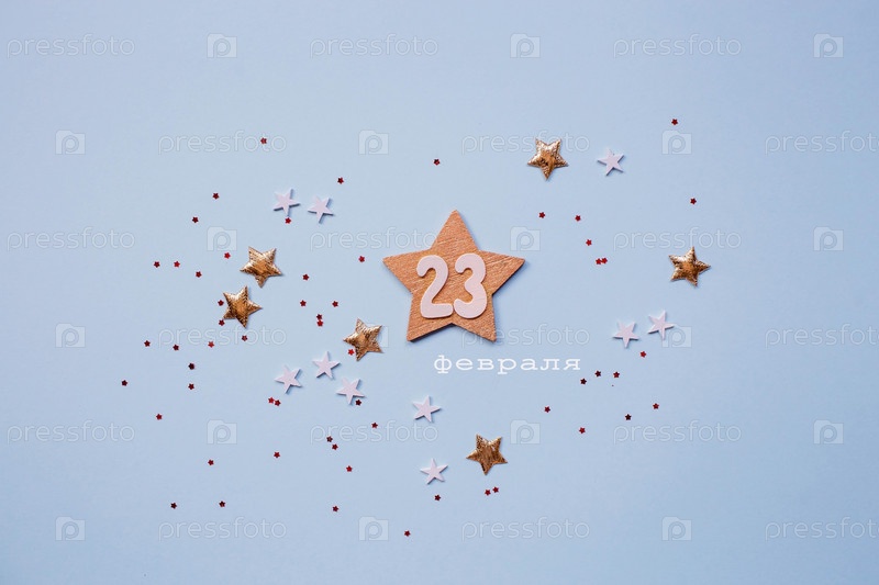 Открытка ко Дню защитника Отечества. Надпись на русском языке. Белые, золотые, красные звезды и дата 23 февраля на голубом фоне. Праздник 23 февраля