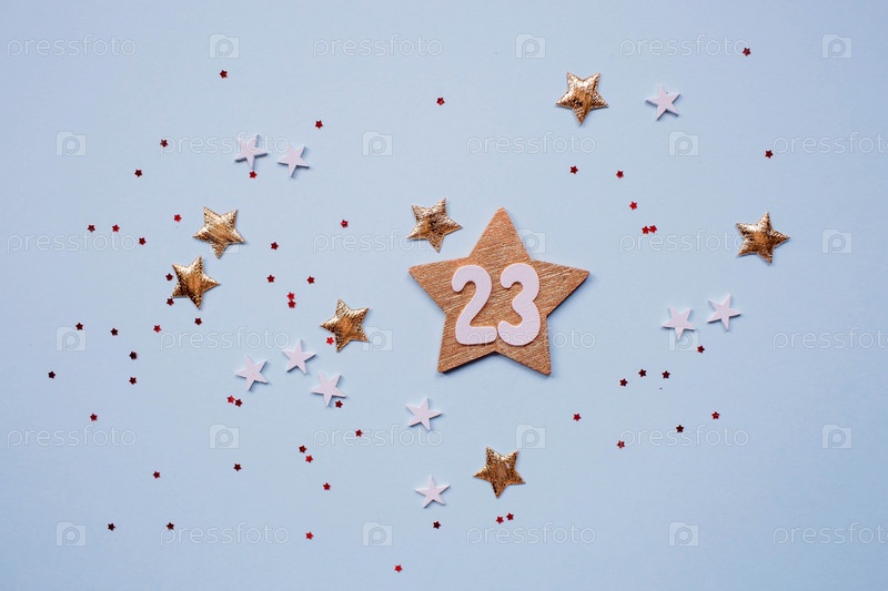 Открытка ко Дню защитника Отечества. Белые, золотые, красные звезды и цифра 23 на голубом фоне. Праздник 23 февраля
