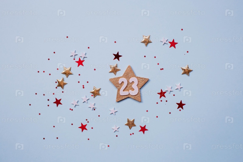 Открытка ко Дню защитника Отечества. Белые, золотые, красные звезды и цифра 23 на голубом фоне. Праздник 23 февраля