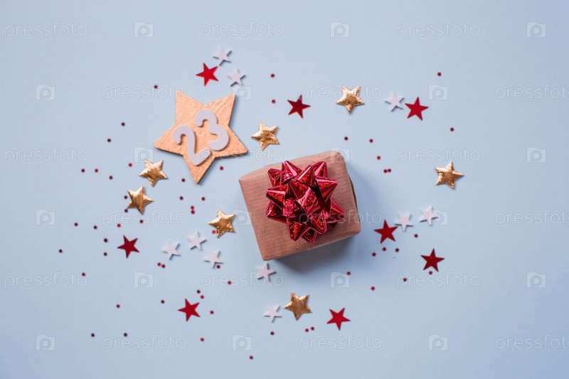 Открытка ко Дню защитника Отечества. Белые, золотые, красные звезды, подарочная коробка и цифра 23 на голубом фоне. Праздник 23 февраля