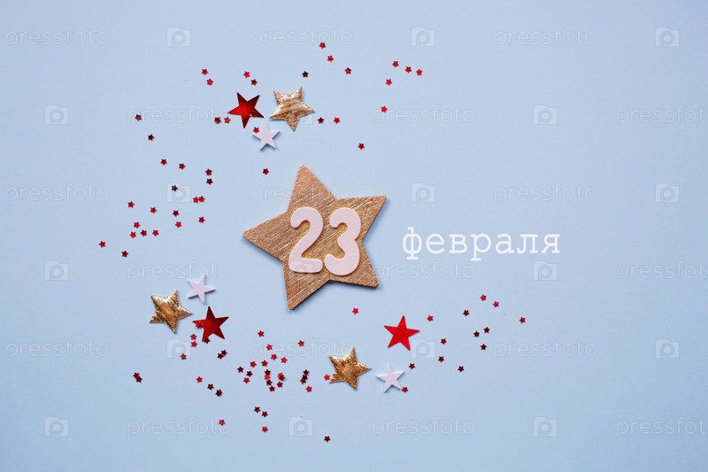 Открытка ко Дню защитника Отечества. Надпись на русском языке. Белые, золотые, красные звезды и дата 23 февраля на голубом фоне. Праздник 23 февраля