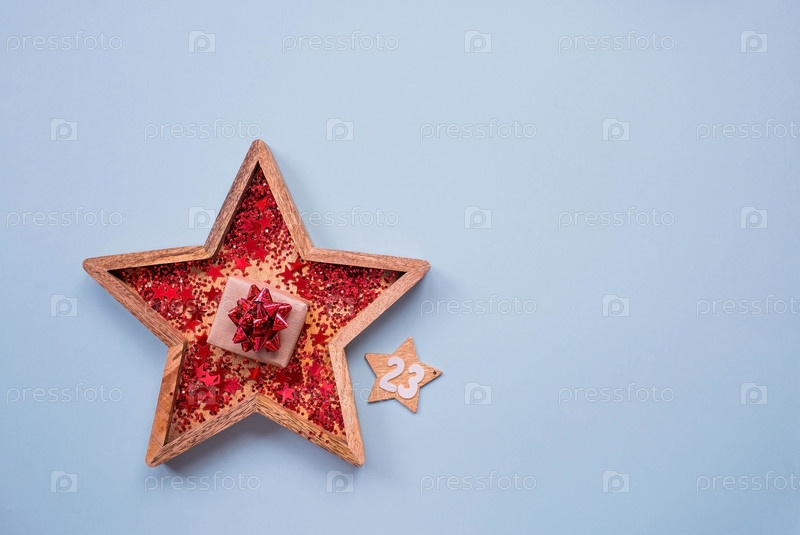 Открытка ко Дню защитника Отечества. Белые, золотые, красные звезды, подарочная коробка и цифра 23 на голубом фоне. Праздник 23 февраля