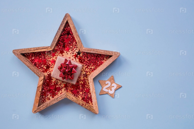 Открытка ко Дню защитника Отечества. Белые, золотые, красные звезды, подарочная коробка и цифра 23 на голубом фоне. Праздник 23 февраля