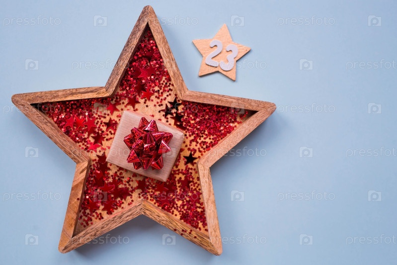 Открытка ко Дню защитника Отечества. Белые, золотые, красные звезды, подарочная коробка и цифра 23 на голубом фоне. Праздник 23 февраля
