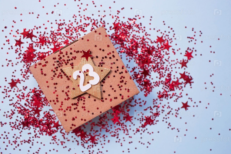 Открытка ко Дню защитника Отечества. Белые, золотые, красные звезды, подарочная коробка и цифра 23 на голубом фоне. Праздник 23 февраля