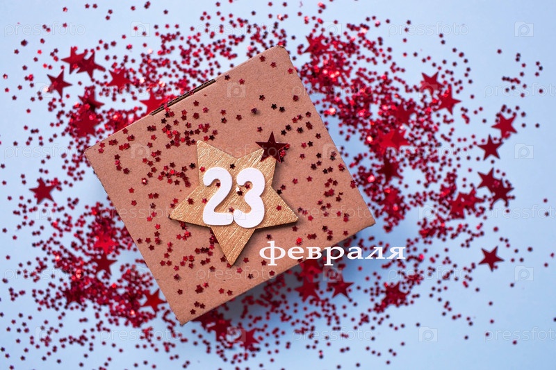 Открытка ко Дню защитника Отечества. Надпись на русском языке. Белые, золотые, красные звезды, подарочная коробка и цифра 23 на синем фоне. Праздник 23 февраля