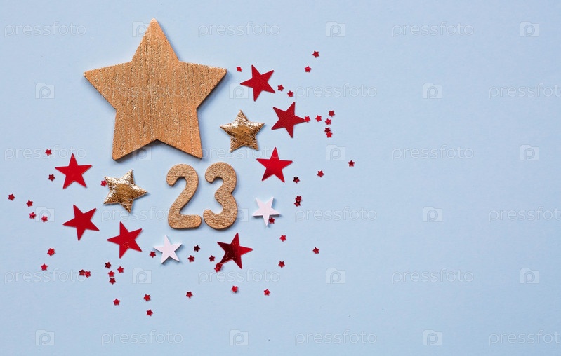 Открытка ко Дню защитника Отечества. Белые, золотые, красные звезды и цифра 23 на голубом фоне. Праздник 23 февраля