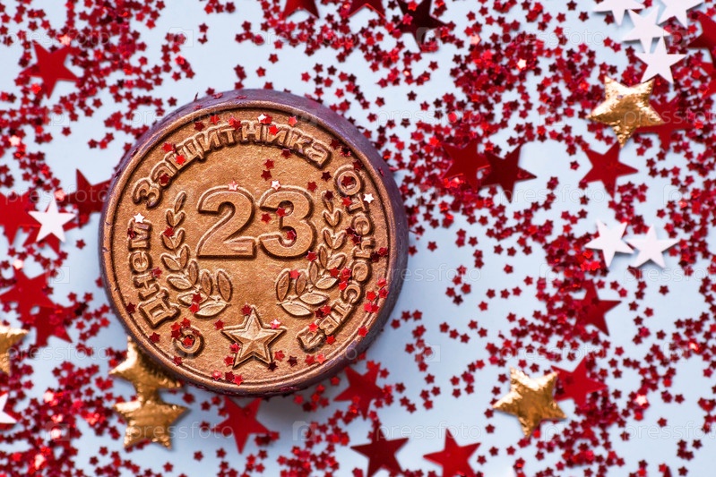 Открытка ко Дню защитника Отечества. Надпись на русском языке. Белые, золотые, красные звезды, железная медаль с датой 23 февраля на синем фоне. Праздник 23 февраля