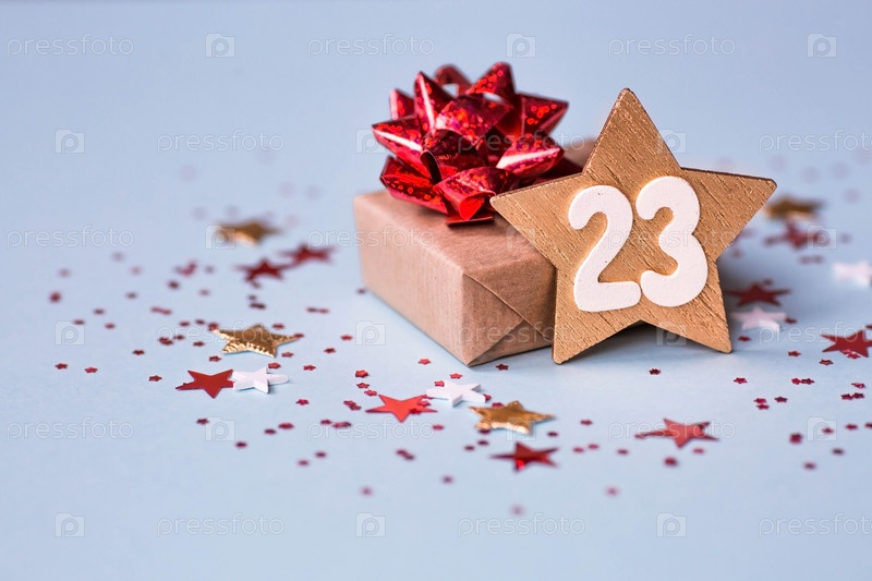 Открытка ко Дню защитника Отечества. Белые, золотые, красные звезды, подарочная коробка и цифра 23 на голубом фоне. Праздник 23 февраля