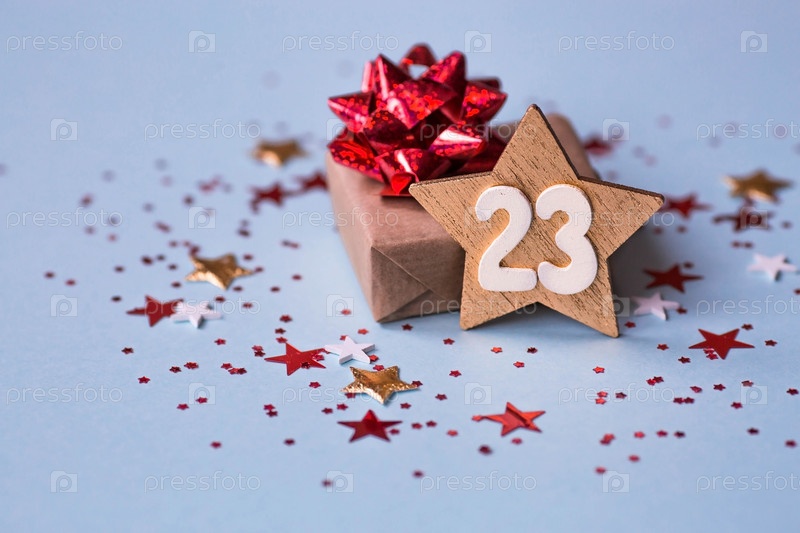 Открытка ко Дню защитника Отечества. Белые, золотые, красные звезды, подарочная коробка и цифра 23 на голубом фоне. Праздник 23 февраля