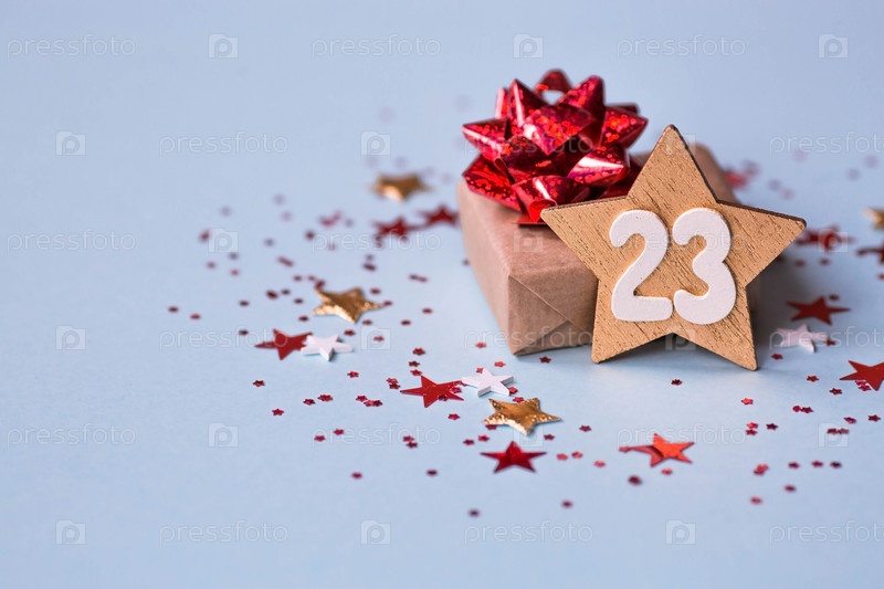 Открытка ко Дню защитника Отечества. Белые, золотые, красные звезды, подарочная коробка и цифра 23 на голубом фоне. Праздник 23 февраля