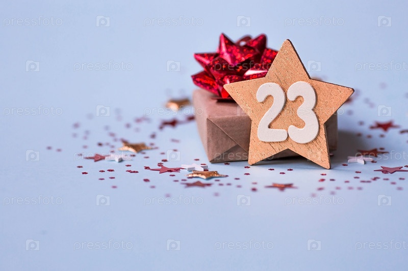 Открытка ко Дню защитника Отечества. Белые, золотые, красные звезды, подарочная коробка и цифра 23 на голубом фоне. Праздник 23 февраля