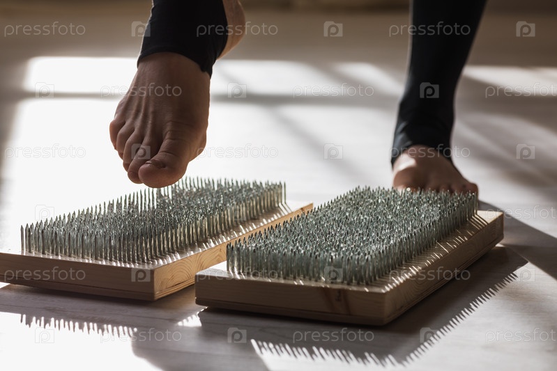 Женщина, практикующая йогу, наступает на доску с гвоздями. Концепция на тему массажа