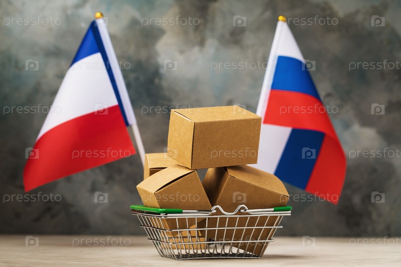 Различные коробки в продуктовой корзине и два флага на абстрактном фоне, концепция торговли между Францией и Россией