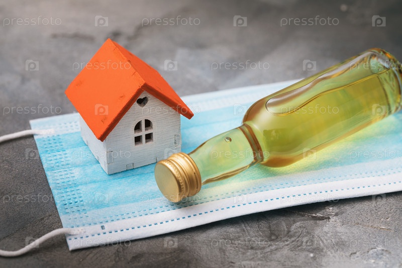 Игрушечный домик, бутылочка виски и медицинская маска на столе, концепция злоупотребления алкоголем в карантине