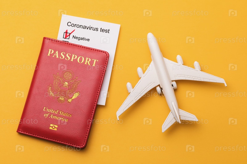 Игрушечный самолет, американский паспорт и результаты теста на коронавирус на желтом фоне, вид сверху