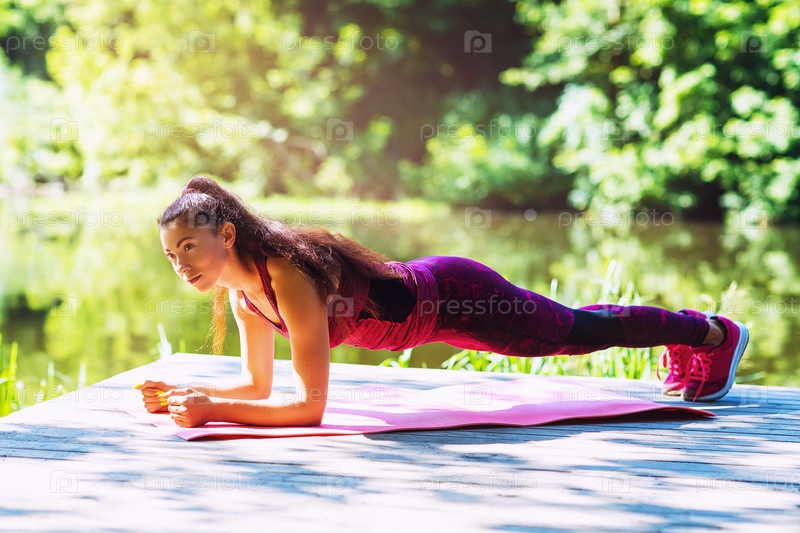Девушка-спортсменка выполняет упражнения на доске на берегу реки теплым солнечным утром. Концепция здорового образа жизни