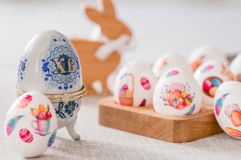 Большая яичная коробка с надписью XB, пасхальный кролик и пасхальные яйца на льняной салфетке на столе