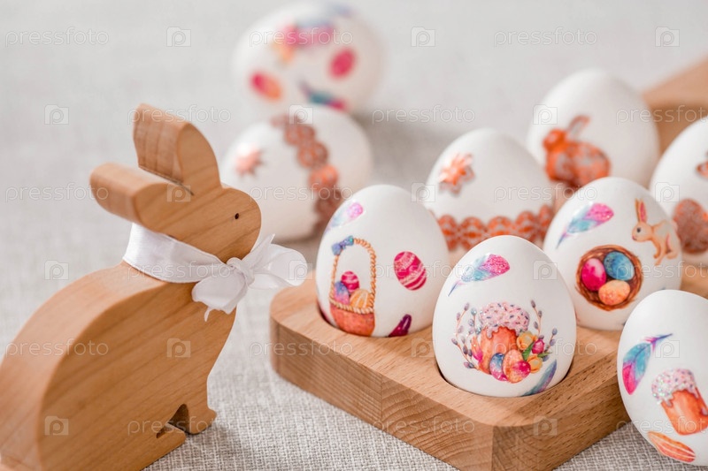 Деревянный пасхальный кролик с бантом и пасхальными яйцами на льняной скатерти на столе. Концепция праздника Светлой Пасхи