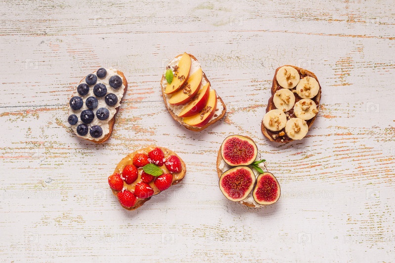 Домашний летний тост со сливочным сыром, ореховым маслом и фруктами и ягодами