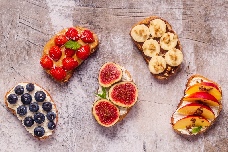 Домашний летний тост со сливочным сыром, ореховым маслом и фруктами и ягодами