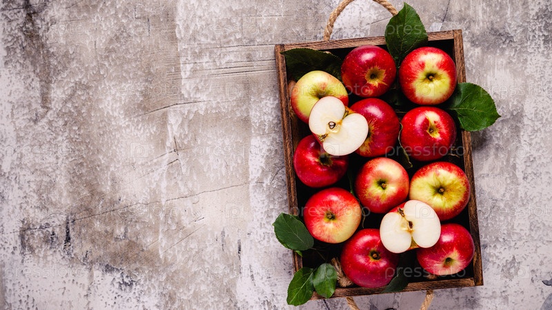 Спелые красные яблоки в деревянном ящике
