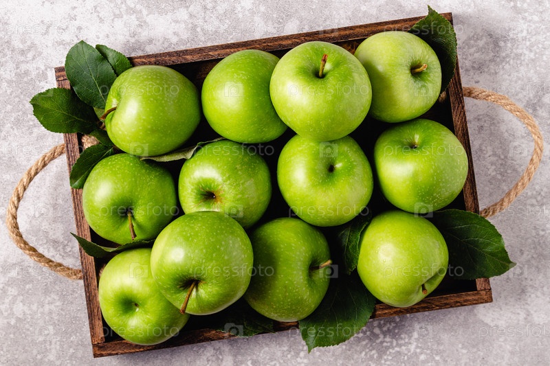 Спелые зеленые яблоки в деревянном ящике