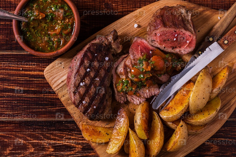 Стейк на гриле с картофельными дольками, сальсой и специями